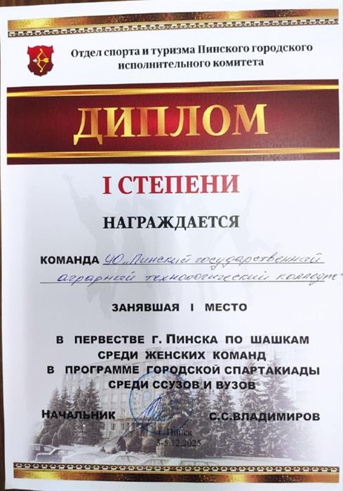 Поздравляем сборную команду девушек учреждения образования "Пинский государственный аграрный технологический колледж" по шашкам занявшую первое 🥇🏆 место, в первенстве города Пинска среди женских команд учащихся ССУЗов, ВУЗов.🏆