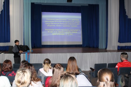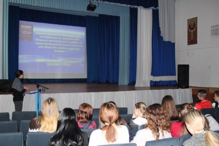 В связи с этим в колледже был организован правовой ликбез с учащимися нового набора под лозунгом «Соблюдай закон, поступай по совести», организованный преподавателем Невдах С.Н. На встрече поднимались вопросы законодательного регулирования правонарушений несовершеннолетних, их квалификация, обсуждались причины противоправного поведения несовершеннолетних, демонстрировались видеоматериалы соответствующей направленности.