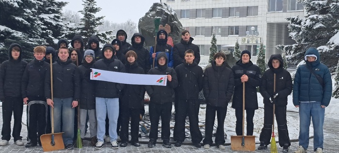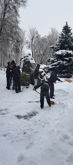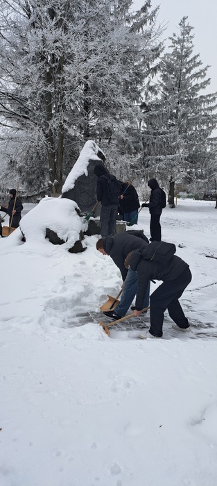 Учащиеся механического отделения с председателем первичной организации РОО «Белая Русь» учреждения образования «Пинский государственный аграрный технологический колледж» - Сергеем Анатольевичем Курадовцом в рамках акции «Снежный бум Белой Руси», очистили от снега памятный знак Воинам интернационалистам на территории городского парка культуры и отдыха им.Краснознаменной Днепровской флотилии.